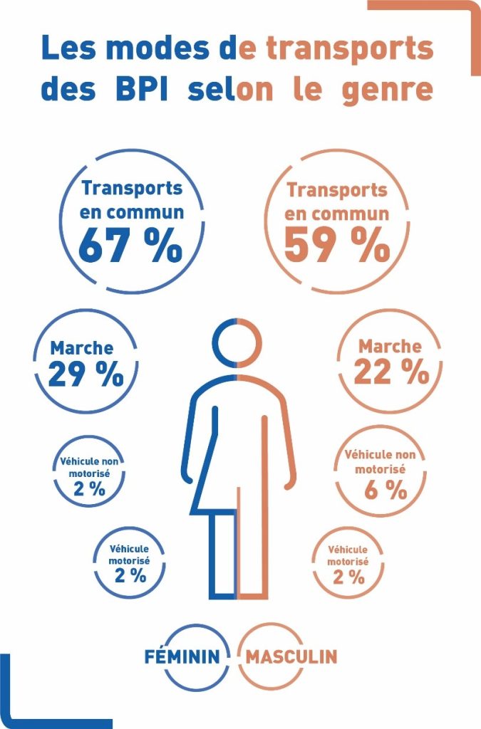 Les transports en commun sont plus fréquemment mentionnés pour les femmes que pour les hommes (67% de femmes BPI contre 59% d’hommes BPI) tout comme la marche (22% d’hommes BPI contre 29% pour les femmes).
