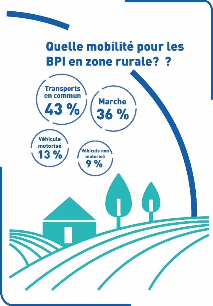 Pour autant, l’usage de véhicules non motorisés comme des vélos est similaire en zone rurale (9% de BPI résidents en zone rurale) et en zone urbaine (8%). Malgré les distances, 36% des BPI vivant en zone rurale indiquent la marche comme mode de déplacement contre 24% des BPI en zone urbaine. Autre différence, l’usage des véhicules motorisés est plus important en zone rurale avec 13% d’utilisation par des BPI y résidant contre seulement 3% de ceux qui vivent en zone urbaine.