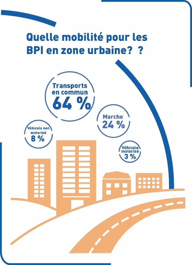 Au-delà des différences globales, les modes de transport se différencient selon le caractère rural ou urbain du lieu de résidence des BPI. Clairement, les territoires urbains favorisent l’utilisation de transports en commun. Ainsi, 64% des BPI vivant en zone urbaine utilisent les transports en commun contre 43% pour les BPI en zone rurale.